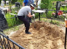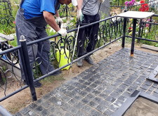 Первым делом мы подготовили участок к работам: демонтировали уже установленное надгробье, а также разровняли почву на могиле, тем самым подготовив её к укладке наземного покрытия.