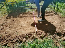 На каждом из четырёх углов вкручиваем сваи. Грунт на данной могиле попался твёрдый, после того, как сваи уже не вкручиваются, начинаем их забивать. Окончательно загнать сваи в землю так и не удалось, поэтому срезаем выступающие части. На качестве каркаса данное решение никак не отобразилось, так как длинна наших свай всегда несколько больше, чем требуется.