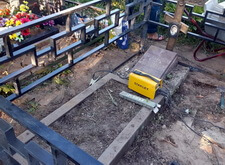 Первое, что мы сделали на могиле – уборку. Тщательно очистив место захоронения от сорной травы и прочего мусора, мы взялись за монтаж ограждения. Ножки оградки вбили в специальные ямы, а по нижней её части проварили металлический борт, служащий одновременно и ограничителем для плитки, и дополнительным каркасом, придающим жёсткость самой конструкции.