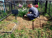 Сорняка на могиле было действительно много, а потому управиться с ним быстро не получилось. Так или иначе мы удалили всю траву, выбросили мусор, дополнительно очистили ступенчатый цветник и протёрли крест.