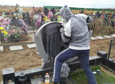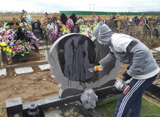 Далее мы полностью заполировали старый портрет и всю надпись, сделали это прямо на кладбище, не перемещая сам памятник.